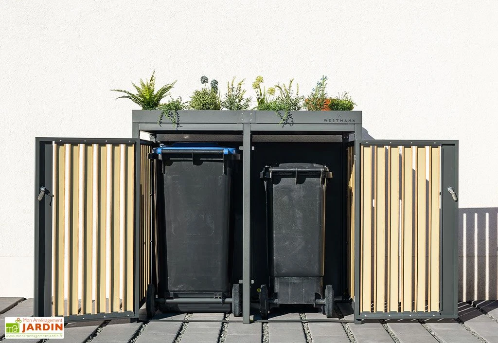 Cet abri poubelle extérieur Westmann mesure 134 cm de longueur, 84 cm de profondeur et 125 cm de hauteur (dimensions intérieures : 133 x 80 x 114 cm) et comprend 2 portes battantes individuelles qui permettront de dissimuler chacune une poubelle de 240 litres. Les poignées sont verrouillables, vous permettant de transformer l’abri en coffre de rangement par exemple. Le seuil bas permet d’entrer et de sortir facilement les 2 poubelles.