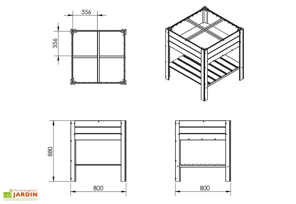 Le bac potager est constitué de planches de 92 mm de largeur et 14 mm d’épaisseur pour les parois, le fond et l’étagère. Les pieds possèdent une section de 58 x 14 mm et les traverses une section de 28 x 28 mm.