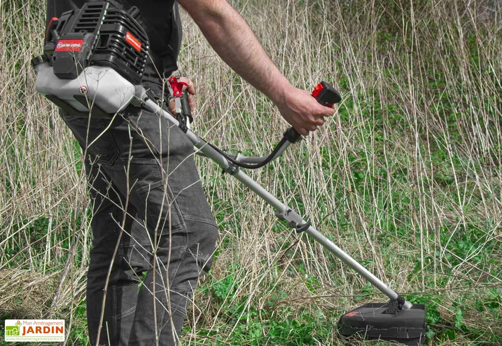 Sous le capot, cette débroussailleuse intègre un moteur 2 temps de 52 CC (7500 t/min) alimenté grâce à un réservoir d’essence d’une capacité de 1,2 L. Ce type de moteur permet de consommer un peu moins de carburant et de réduire l’émission de gaz nocifs sans que cela n’impacte la puissance de l’appareil. Vous profiterez ainsi d’un outil performant pour l’entretien de votre jardin.