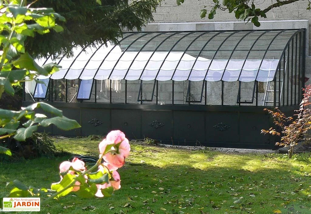 La serre ancienne Chambord mesure 605 x 280 x 270 cm (l,l,h), elle vous offre donc une grande superficie de 16,94 m². La serre adossée est en aluminium laqué avec une peinture sablée (plusieurs coloris sont disponibles, d’autres laquages sont faisables sur demande). Les parois et le toit sont en verre trempé de 4 mm d’épaisseur. Le toit se constitue de petites tuiles pour accentuer encore davantage ce style victorien du début du XXème siècle.
