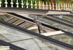 Elle possède trois lucarnes à l’avant de 35 x 63 cm et deux à l’arrière de 35 x 100 cm (l,h). La serre peut être montée en deux versions : sur muret de 87 cm de hauteur à réaliser vous-même ou sur embase en aluminium (comprise en option) de 87 cm de hauteur, ornée d’éléments en relief. Les parois et la toiture sont en verre trempé 4 mm pour un effet de serre optimal. Le modèle dispose d’une porte battante de 100 x 195 cm (l,h), elle est à placer obligatoirement sur la largeur de la serre, à droite ou à gauche au choix.