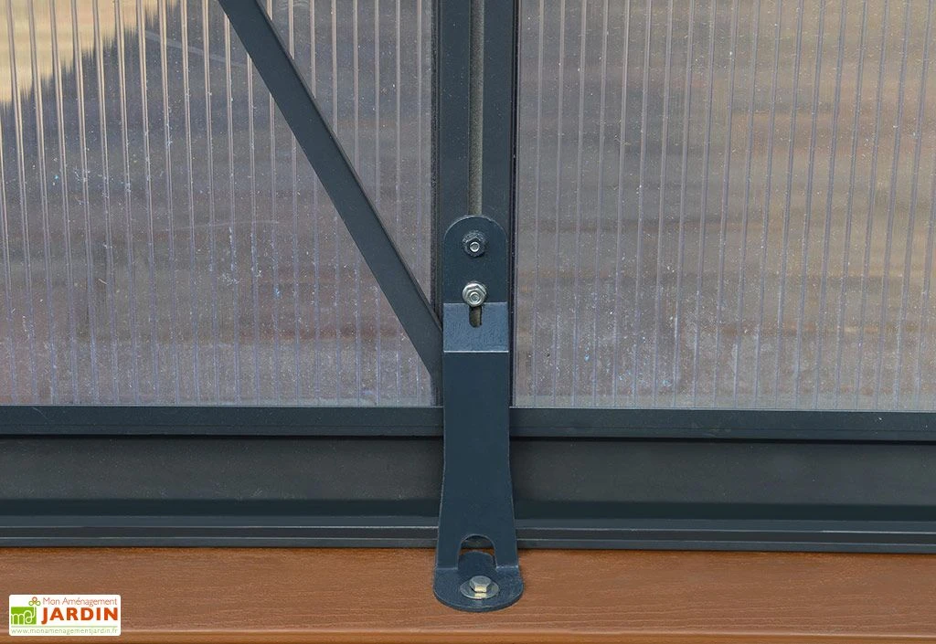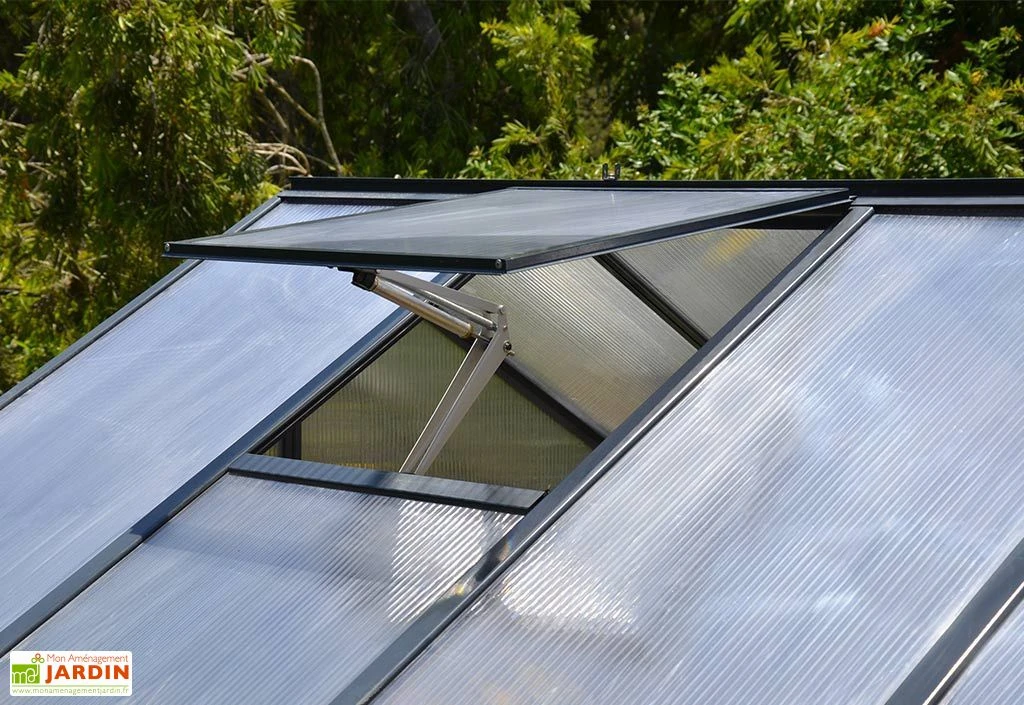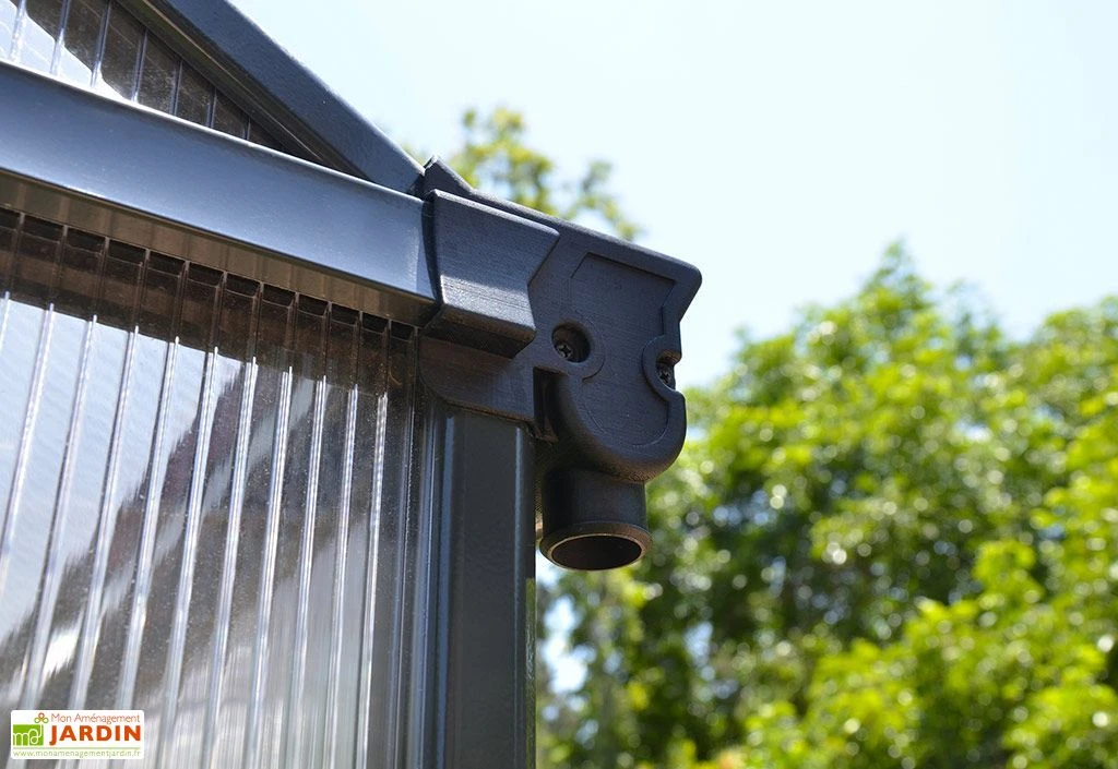 Palram-Canopia a doté sa serre de trois fenêtres de toit dont l’ouverture, automatisée, se déclenchera lorsque la température intérieure atteint les 12 à 15 °C. Ces fenêtres, complétées par une ventilation à volets mobiles, permettent de réguler le taux d’humidité et la température, mais également de garantir la bonne circulation de l’air. Notez enfin la présence de gouttières de 3,2 cm de diamètre pour l’évacuation ou la récupération de l’eau de pluie. Vous pourrez ainsi la réutiliser pour l’arrosage de vos cultures.