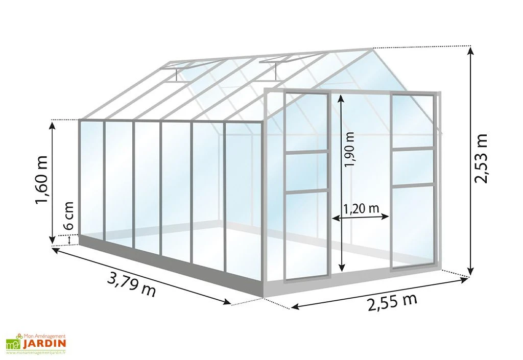 Les dimensions hors tout de la serre sont les suivantes : 2,57 m de largeur, 3,83 m de longueur soit une surface totale de 9,84 m².