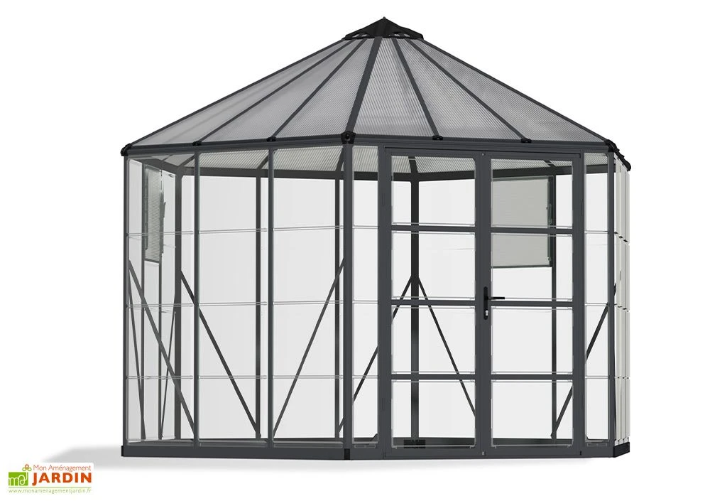 Cette serre s’est en effet vue dotée d’une structure en aluminium, un métal léger mais résistant, ici laqué en gris. Cette structure accueille des parois et une toiture composées de panneaux de polycarbonate (4 mm d’épaisseur pour la toiture, 0,7 mm pour les parois latérales). Le polycarbonate présente de nombreux avantages, dont le fait d’être pratiquement incassable tout en étant flexible et transparent.