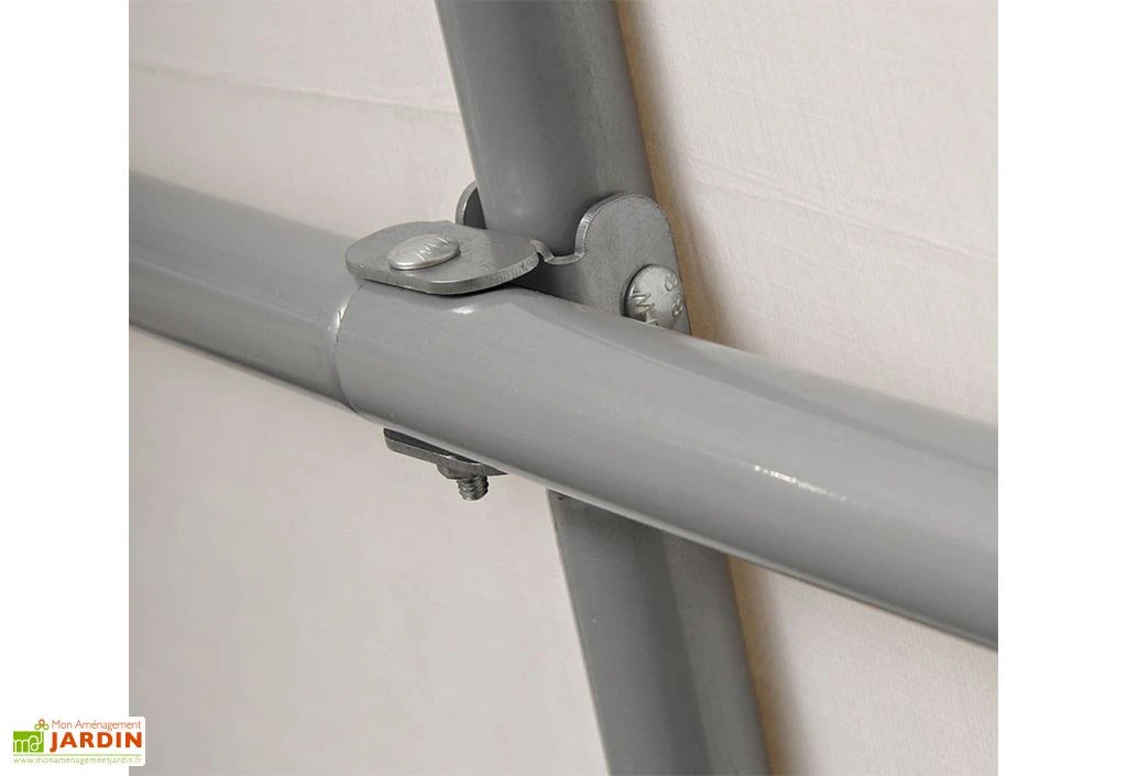 Bien que la serre soit démontable, elle n’en est pas moins particulièrement solide. Elle est constituée d’une armature en acier enduit de 3,5 cm. L’acier enduit résiste parfaitement à la rouille et ne demande pas d’entretien. Elle est recouverte d’une bâche en polyéthylène d’une densité de 160 gr/m². La toile est parfaitement étanche et protégée contre les UV.