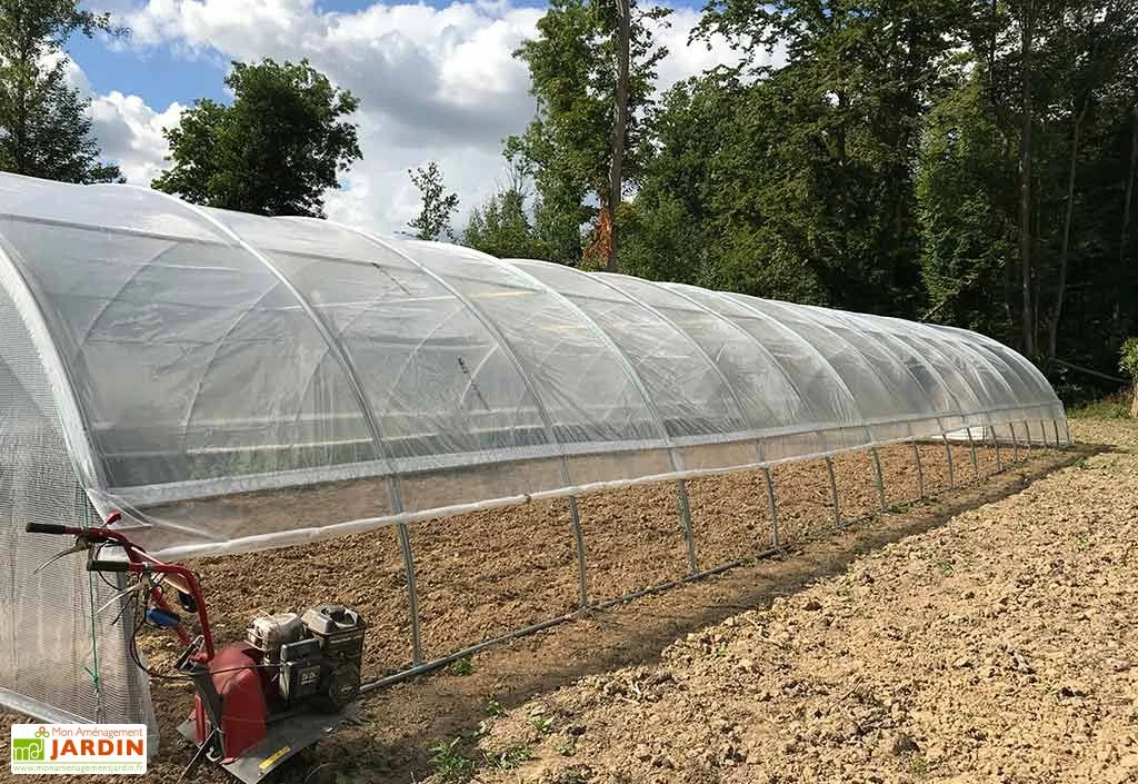 Cette serre maraîchère mobilise une armature constituée d’arceaux métalliques de 30 ou 40 mm de diamètre, selon la version choisie, pour 1,5 mm d’épaisseur. Ces arceaux sont fabriqués en acier galvanisé, un matériau robuste qui ne craint pas la corrosion et sont espacés de 1,50 m les uns des autres. La structure de la serre est recouverte d’une bâche en polyéthylène de 200 microns d’épaisseur. Cette dernière est traitée anti-UV et se montrera tout aussi résistante que les films faits de plastiques plus épais. Il s’agit également d’une solution plus écologique. Les pignons de la serre sont pour leur part revêtus de plastique armé transparent Robustex (400 microns d’épaisseur). Notez également la présence de deux aérations latérales relevables grâce à des manivelles.