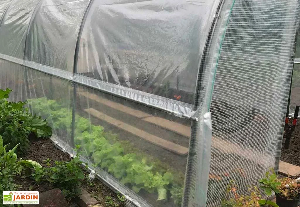 La serre en polyéthylène est équipée de 2 pignons recouverts de PVC armé 400 microns. La façade avant et la façade arrière possèdent toutes les deux une porte battante de 1,00 m. Ces deux portes permettent de circuler facilement dans la serre et de créer un courant d’air permettant de rafraichir l’air.