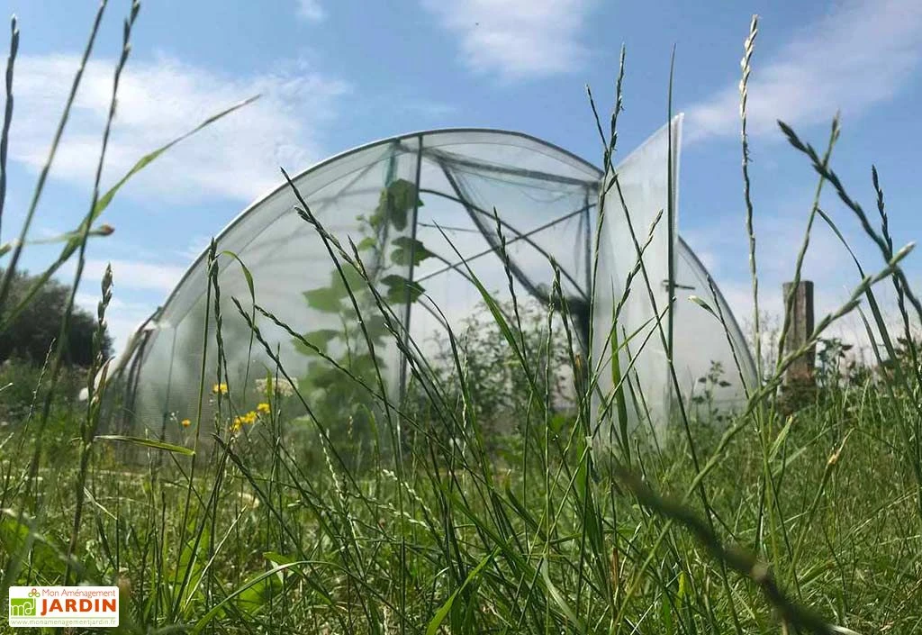 La bâche de toit qui recouvre la serre souple est en polyéthylène 200 microns. Les façades avant et arrière sont couvertes d’une toile en PVC armé 400 microns. Une porte de 1,35 m de largeur est à installer sur la façade avant. Vous trouverez une porte supplémentaire dans la rubrique « Accessoires » si vous souhaitez en installer une sur la façade arrière.