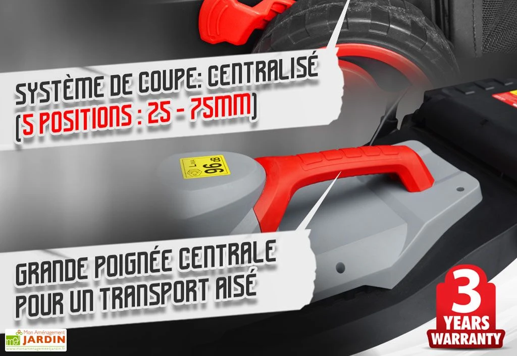 La tondeuse électrique est très légère grâce son faible poids (12,4 kg). Elle est aussi maniable grâce à sa poignée centrale et ses roues avant et arrière qui mesurent respectivement 13,5 cm et 16 cm de diamètre. La tondeuse est également facile à transporter grâce à son guidon pliable. Cette tondeuse possède un carter en polypropylène qui est très léger, qui résiste aux chocs et demande peu d’entretien.